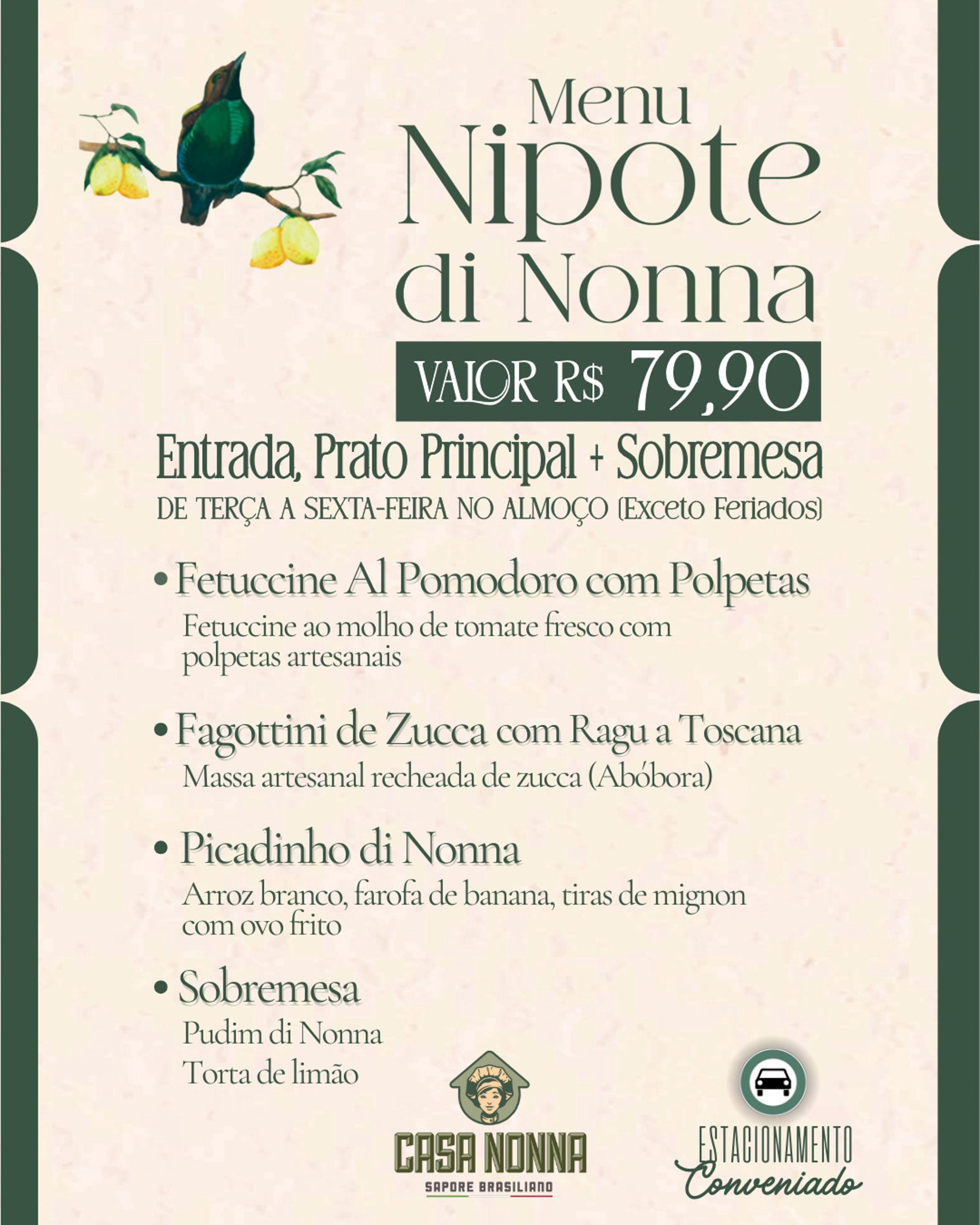 Na Casa Nonna, cada refeição é um convite para viver momentos únicos. Almoços que confortam, jantares que unem e sabores que se transformam em memórias inesquecíveis.